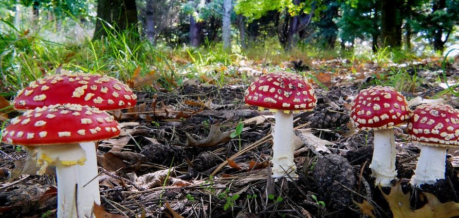 Der Fliegenpilz ist ein roter oder gelber Pilz mit weißen Flecken und einem charakteristischen roten bis orangefarbenen Hut. Er enthält die psychoaktiven Chemikalien Ibotensäure und Muscimol.